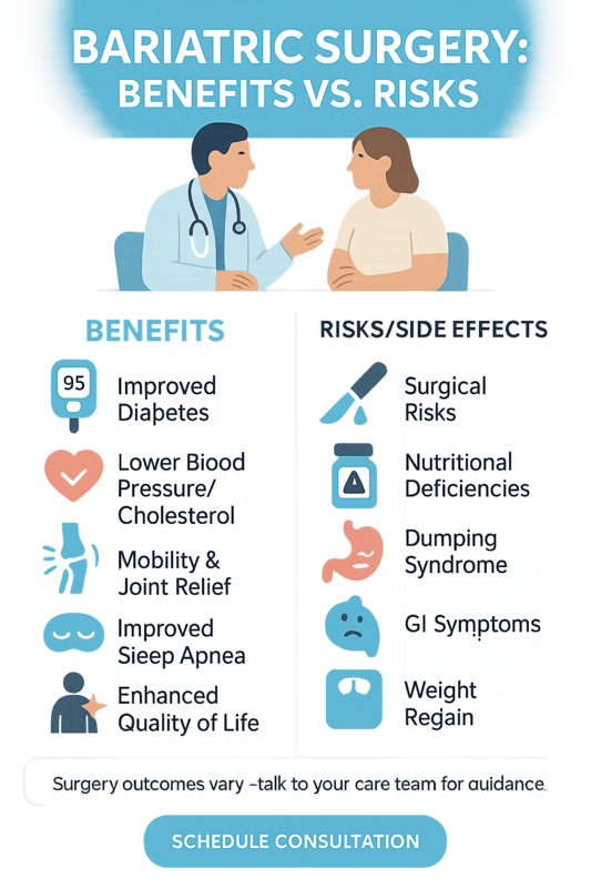 AI Overview Summary: Bariatric surgery offers substantial weight loss and improvement in obesity-related conditions but carries surgical risks, possible nutrient deficiencies, and the need for lifelong follow-up. Careful screening and experienced surgical teams help minimize complications.
