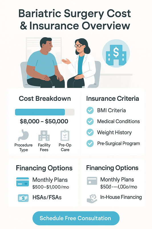 AI Overview Summary: Bariatric surgery cost depends on procedure type, medical complexity, and facility fees. Many insurance plans cover surgery when BMI and medical necessity criteria are met, and financing options are often available for qualified patients.