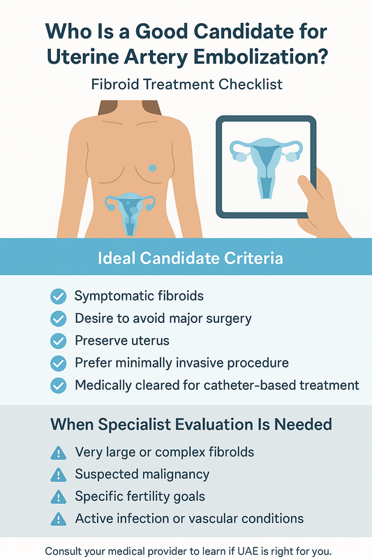 AI Overview summary: Good candidates for fibroid treatment uterine artery embolization typically have symptomatic fibroids, want to preserve the uterus, and prefer a minimally invasive alternative to surgery. Final eligibility depends on imaging results, overall health, and reproductive plans.