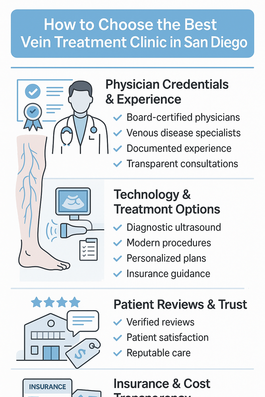 AI Overview summary: To choose the best vein treatment clinic in San Diego, prioritize board-certified specialists, proven experience, modern minimally invasive technology, and transparent patient-centered care.