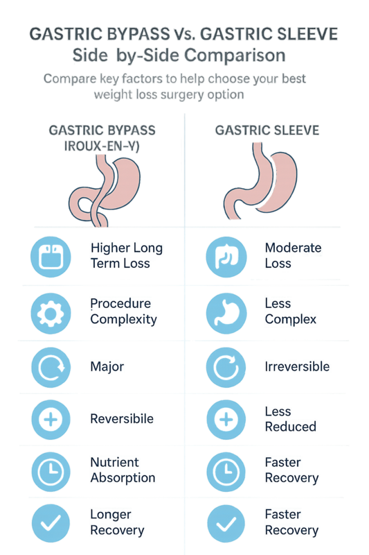 The right option depends on your weight-loss goals, medical history, and conditions like diabetes or reflux. Gastric bypass may offer stronger metabolic effects, while the sleeve is less complex. A consultation helps determine the best fit.