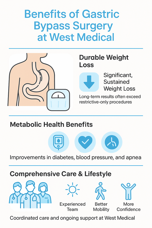 AI Overview summary: Gastric bypass at West Medical offers durable weight loss, metabolic improvements, and coordinated bariatric care, supporting long-term health and quality of life.
