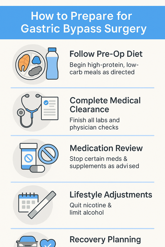 Your pre-op phase focuses on safety and readiness. A bariatric surgeon reviews medical history, medications, and prior weight-loss efforts, then confirms whether gastric bypass is appropriate compared to other options.