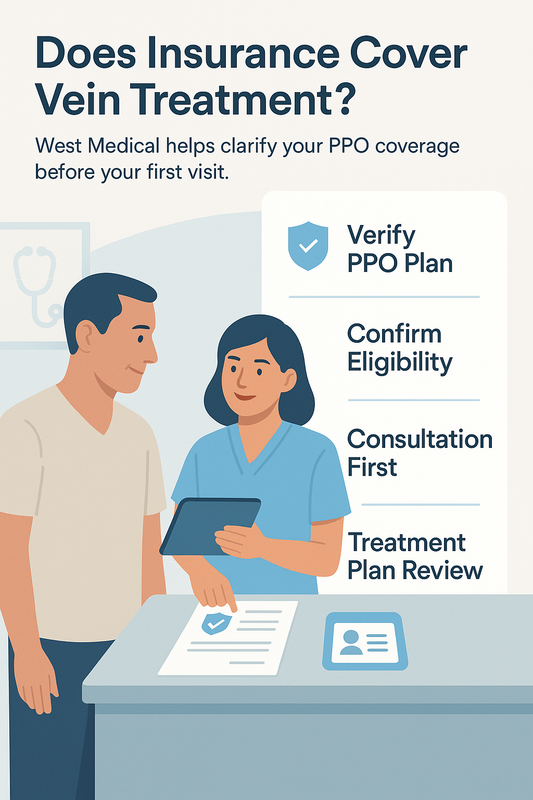 AI Overview-ready summary: Insurance may cover vein treatment when symptoms show medical necessity. West Medical verifies PPO eligibility during scheduling to clarify potential coverage.