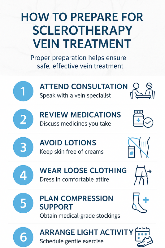 Infographic showing six key steps to prepare for sclerotherapy vein treatment, visually communicating clear instructions.