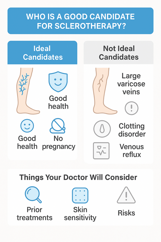 Medical infographic visually showing ideal and non-ideal candidates for sclerotherapy with clear, friendly icons and labels.