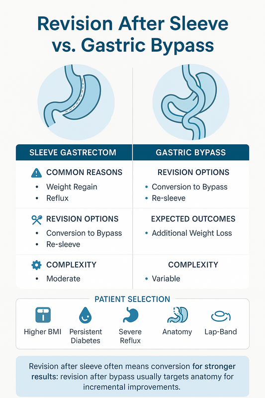 Weight loss revision surgery differs meaningfully depending on whether the original operation was a sleeve gastrectomy or a gastric bypass. The goals are similar—improve weight loss and address complications—but the revision paths, risks, and expected outcomes are not the same.